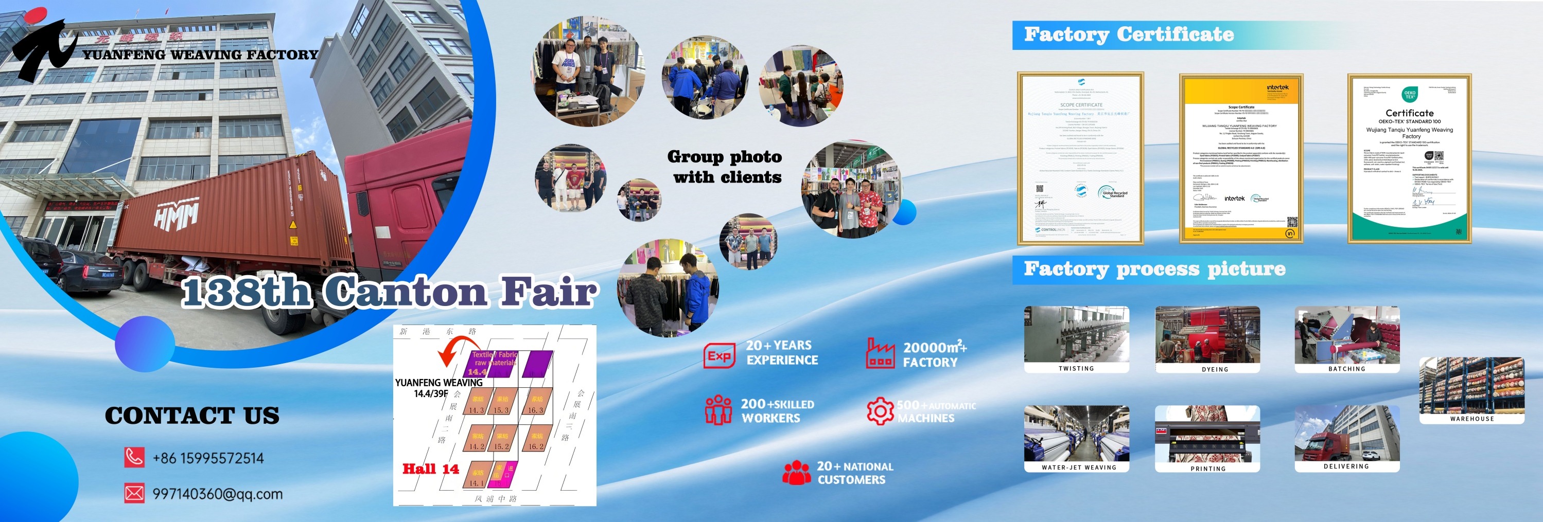 Prodotti principali: Tessuto in poliestere, tessuto di cotone, tessuto Jacquard, tessuto musulmano, tessuto per esterni